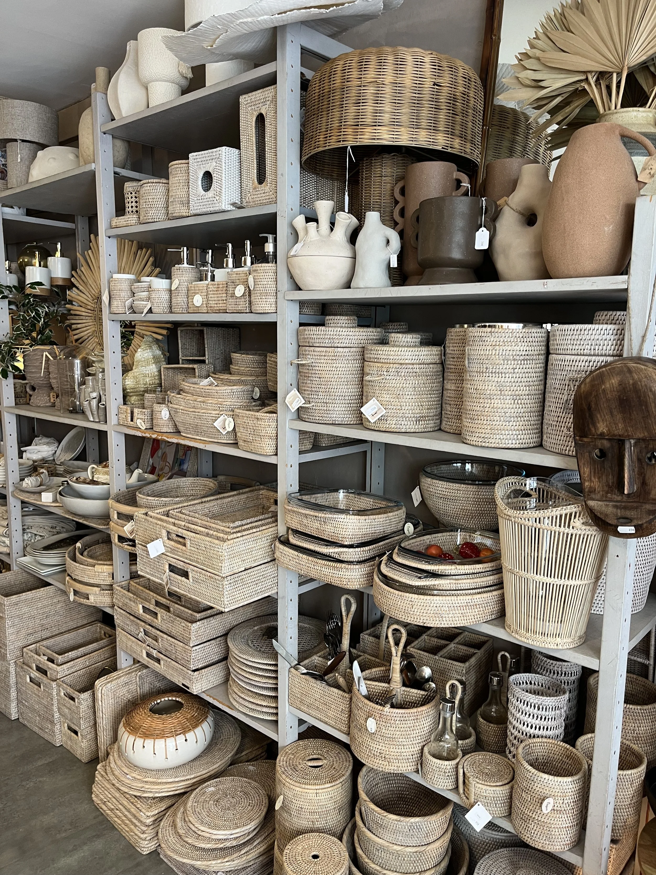 warm, light woods and textures abound, woven and weathered, time-worn palette of blues, grays and greens, floral fabrics celebrate natural gardens
